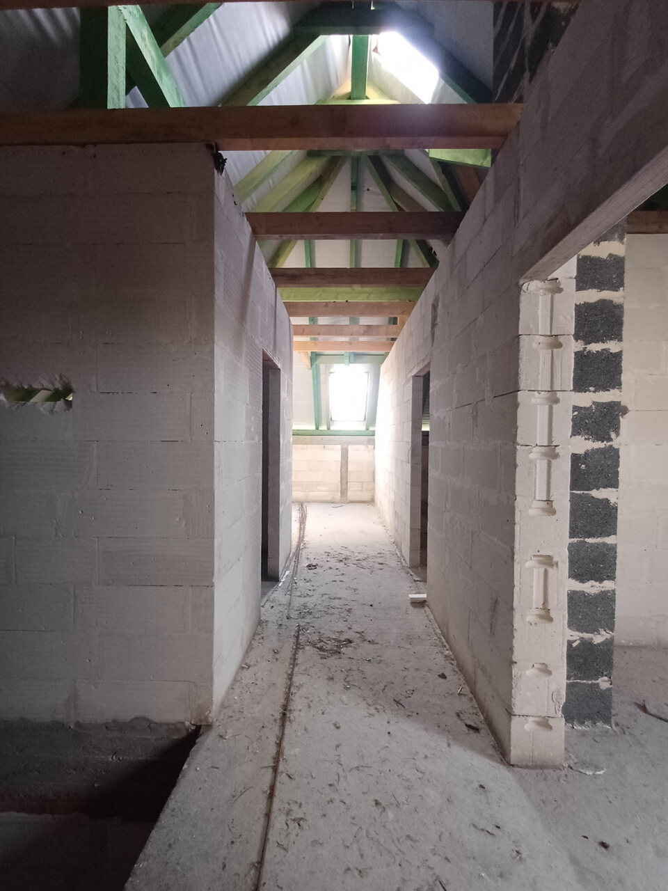 Budynek jest w stanie surowym zamkniętym otwartym – przykryty dachem, lecz bez stolarki okiennej i drzwiowej.